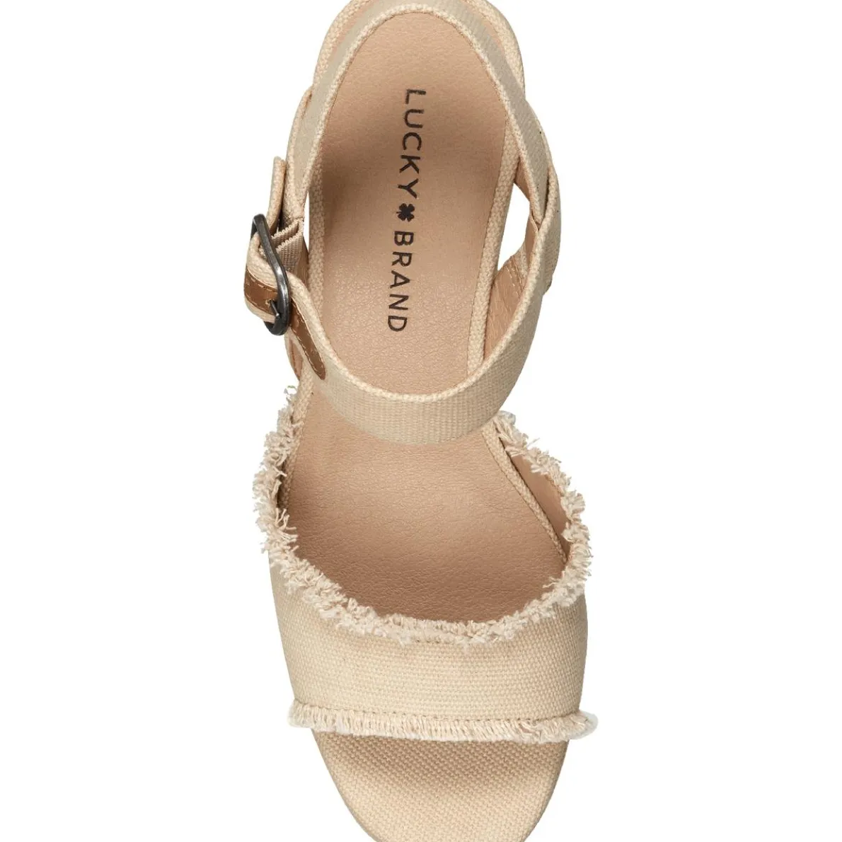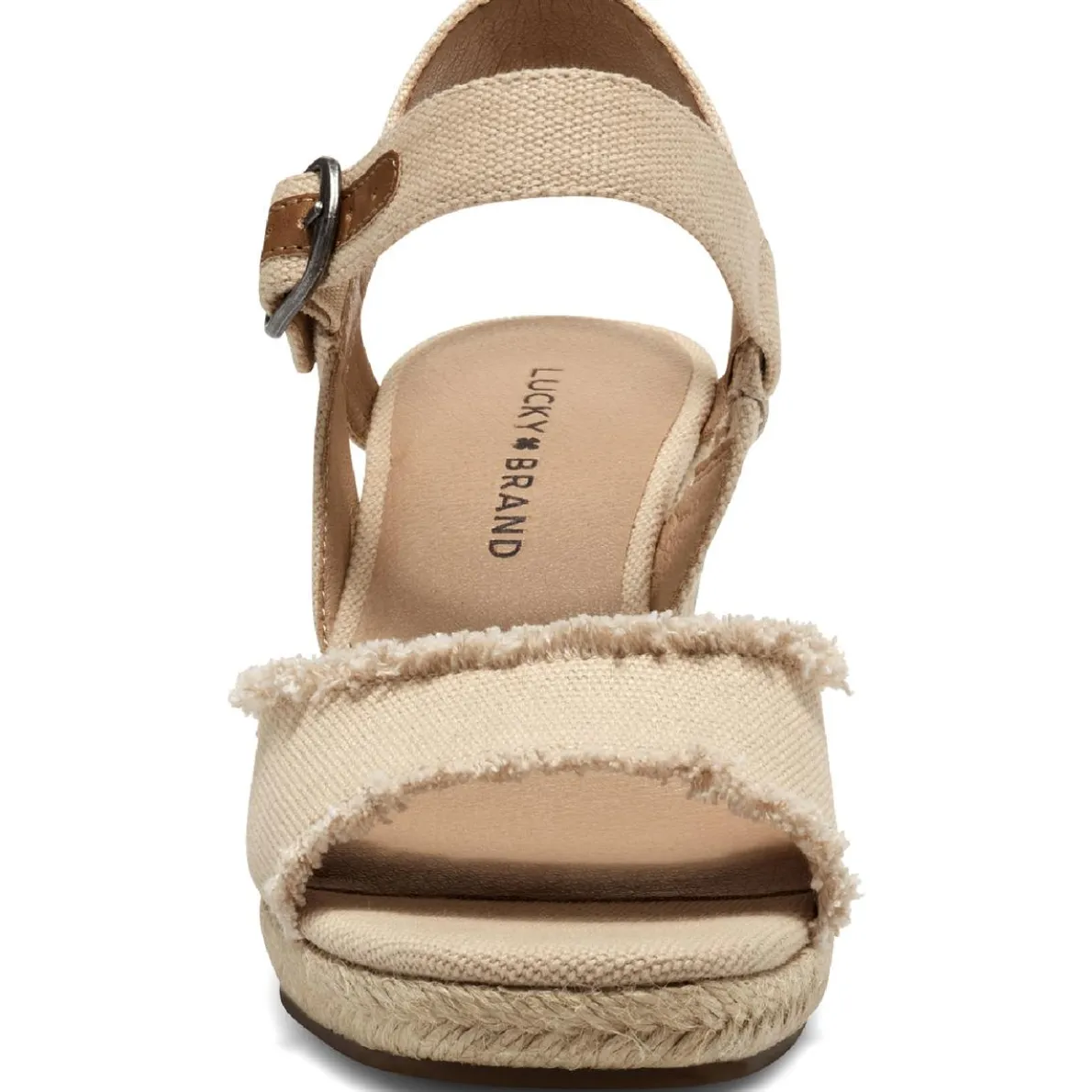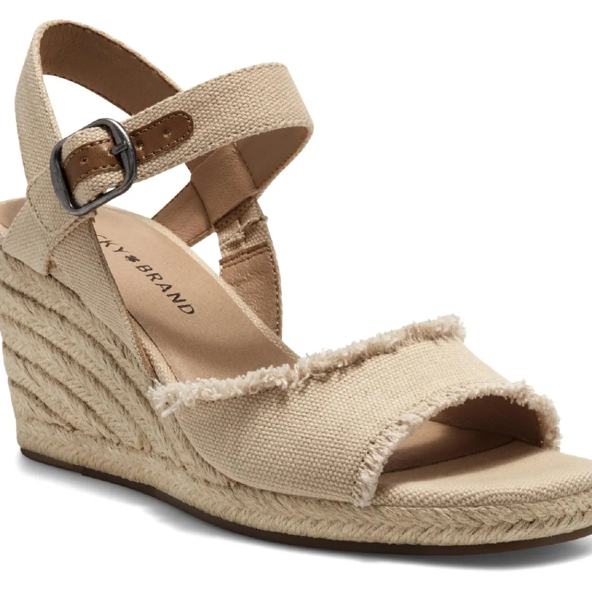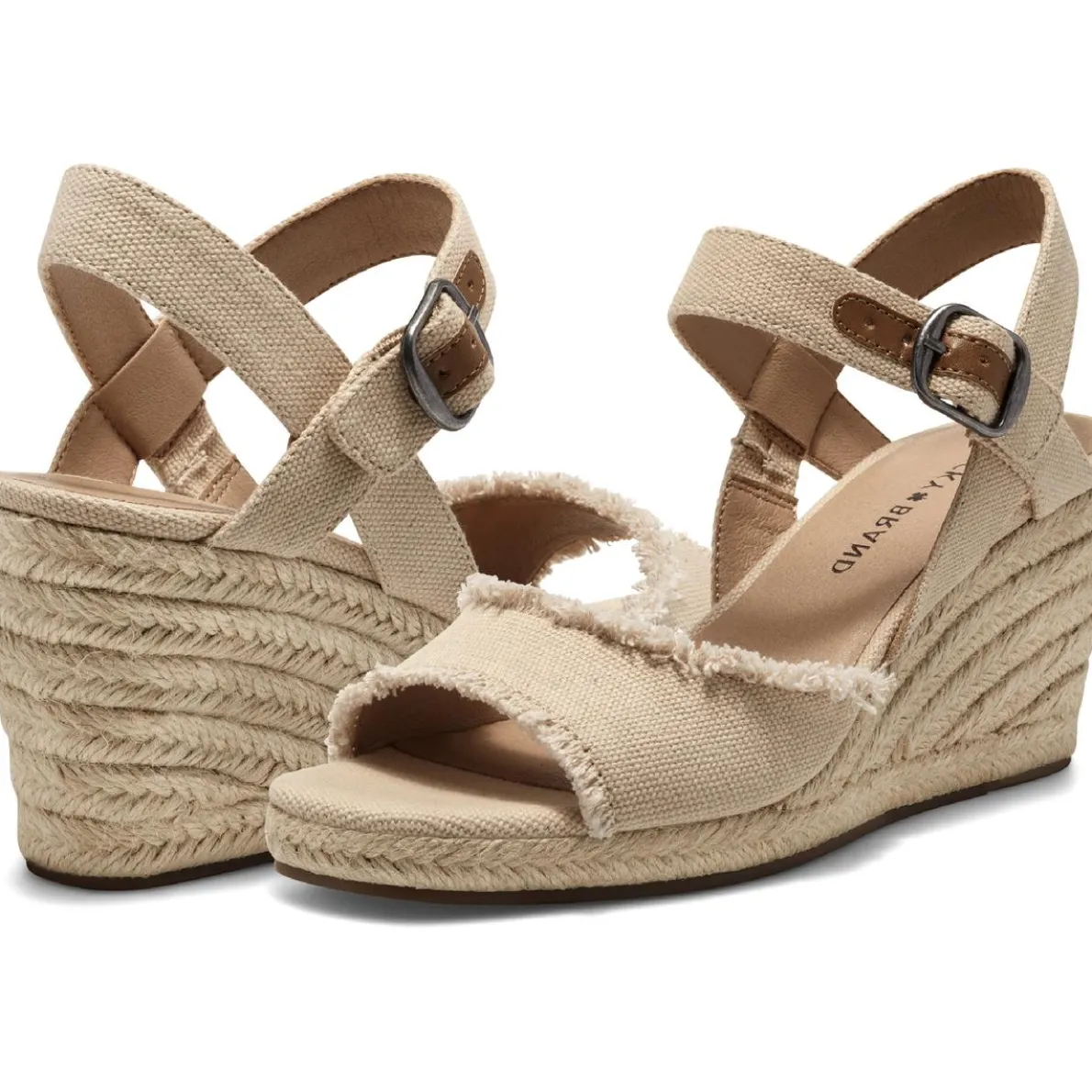 Since 1990, Lucky Brand has been making great fitting, vintage inspired jeans in Los Angeles, CA. Lucky Brand stays true to the rich heritage of the all American spirit with jeans representing the free thinker, the artist and the dreamer. *True to size* Be in the moment this summer with the Mindra wedge espadrille sandal by Lucky Brand. This sandal is made of canvas uppers with frayed edges or eyelet details and synthetic lining for added comfort. It features faux leather detail on ankle strap. The lightly padded, fixed footbed creates all day wearing comfort while running errands or out with the girls. This shoe also features a square, open toe design, an ankle strap with adjustable buckle closure for snug customized fit, and a jute covered espadrille wedge that measures 3″ while the platform measures .5″ in height. The Lucky Brand specializes in high quality, classic and comfortable shoes with a laid back style and a free spirit feel. Style: LKMINDRASMU